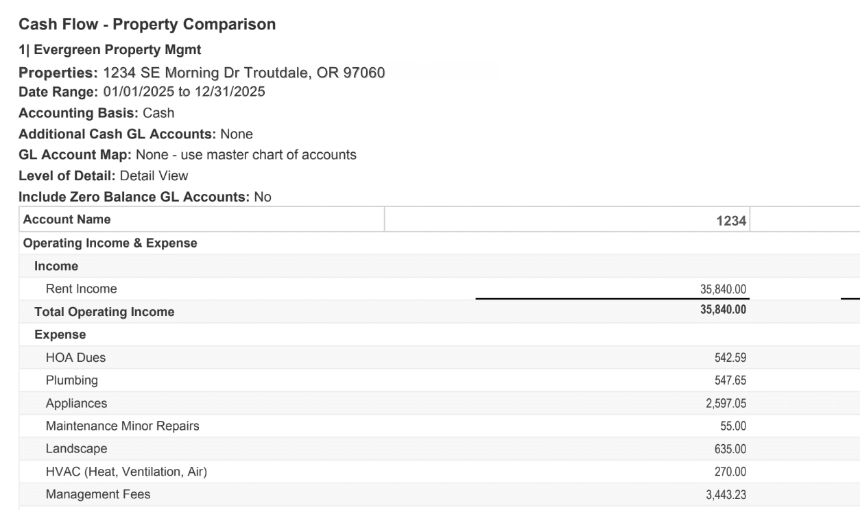 One of the biggest advantages of your Evergreen cash flow statement is how clearly it ties income and classifies expenses in a way that aligns with IRS Schedule E categories.